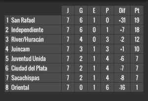 Posiciones Tabla Anual Sub 15: San Rafael 53 pts (C), Independiente 52, Juventud Unida 35, Juincam 33, Ciudad del Plata 27, River/Huracán 18, Oriental y Sacachispas 12.