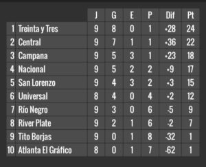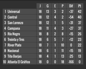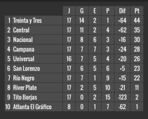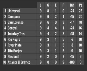 Acumulada de Clubes: Central 75 pts, Universal 68, Treinta y Tres 67, Campana 65, San Lorenzo 60, Nacional 49, Río Negro 45, River Plate 33, Tito Borjas 12, Atlanta El Gráfico 1