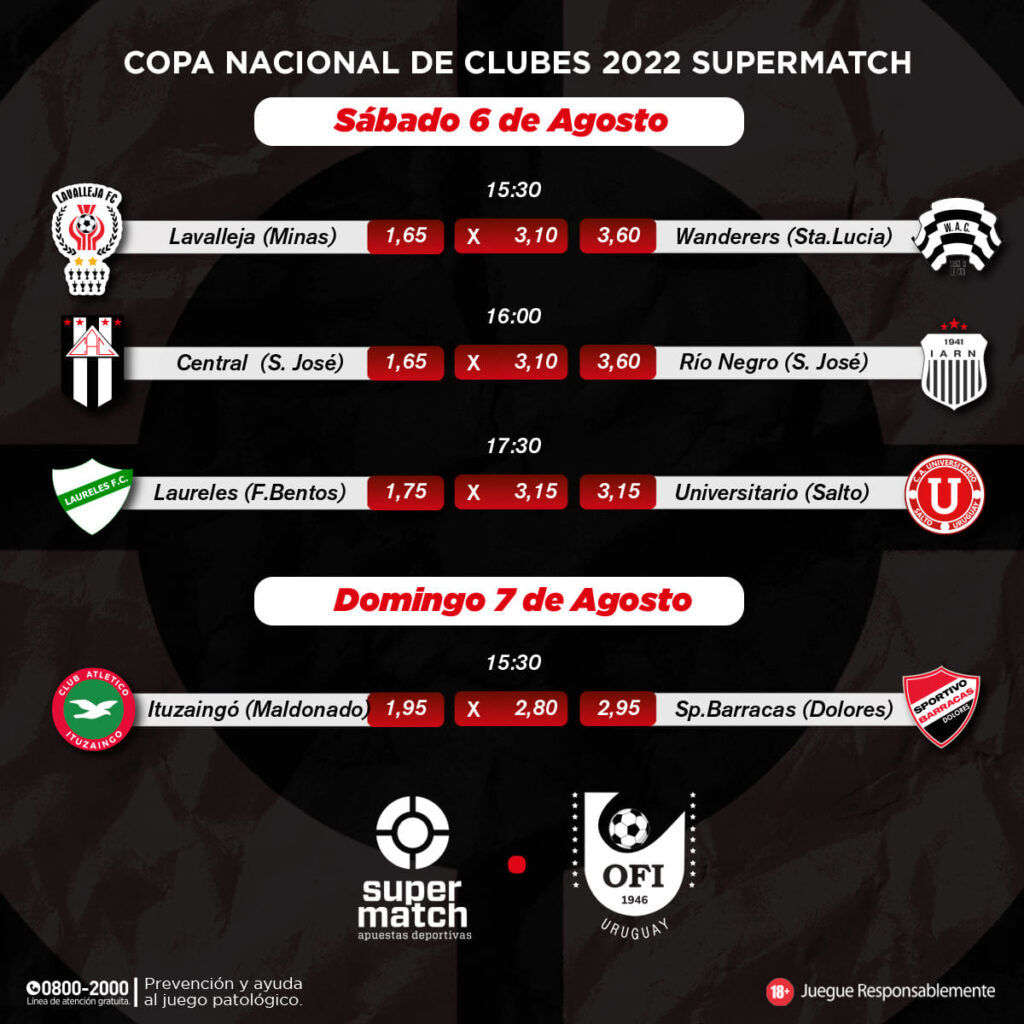 Supermatch permite jugar con los cuatro partidos de la categoría, cada uno ya con sus correspondientes dividendos, pero además la modalidad «en vivo» con la innumerable cantidad de posibildiades que la misma brinda, en los dos juegos televisados del fin de semana. En esta oportunidad serán el sábado Laureles ante Universitario, y el domingo Ituzaingó con Sportivo Barracas.