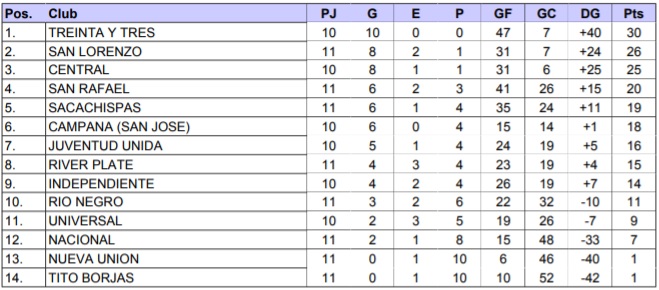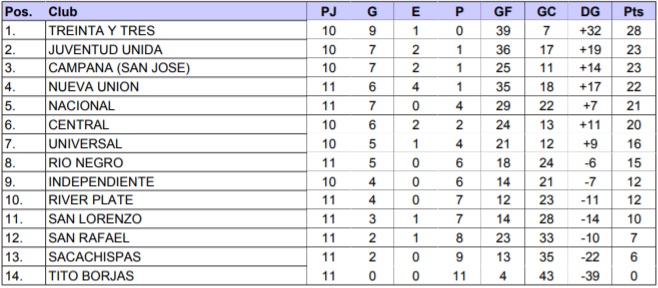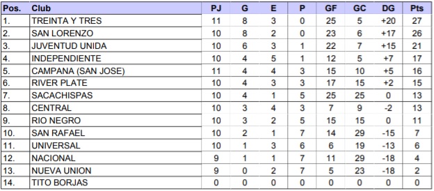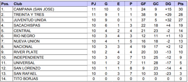 Tabla Acumulada: Treinta y Tres 305 pts, Campana 290, Central 264, Juventud Unida 255, San Lorenzo 242, River Plate 189, Río Negro 187, Sacachispas 181, Nacional 170, Nueva Unión 161, San Rafael 137, Independiente 128, Universal 101, Tito Borjas 23