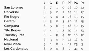 De esta forma el fixture quedó cumplido en un 100% antes de que se jueguen los últimos partidos de cada equipo (con la excepción de Río Negro que tiene libre). San Lorenzo ya aseguró ser el primero, mientras que Universal también confirmó una clasificación que seguramente lo tenga como segundo. Pese a que el cebrita no disputa unidades, está en carrera por un boleto, también cuentan con opciones Central, Campana, Tito Borjas y Treinta y Tres.