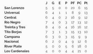 El campeonato tiene situaciones muy diferentes con respecto a la cantidad de partidos de cada uno. Treinta y Tres jugó ocho, Río Negro y Tito Borjas siete, Universal, Central, Campana y Nacional seis, San Lorenzo y River Plate cinco, Los Cardenales cuatro.