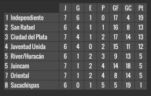 Tabla Anual: Independiente 34 pts, San Rafael 31, Juventud Unida 25, Juincam 23, Ciudad del Plata 20, Oriental 11, River/Huracán 6, Sacachispas 5