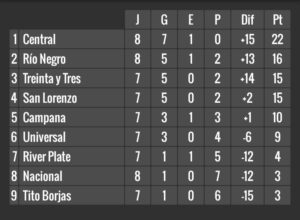 Acumulada de Clubes: Central 85 pts (C), San Lorenzo 84, Universal 67, Campana 56, River Plate 55, Río Negro y Treinta y Tres 54, Nacional 31, Tito Borjas 12