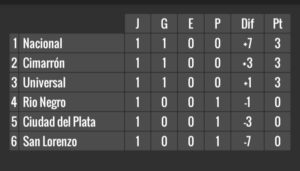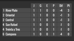 Tabla Anual: River Plate 36 pts, Nacional 33, Campana 27, San Rafael 19, Cimarrón 18, San Lorenzo y Oriental 17, Universal y Central 13, Treinta y Tres 10, Río Negro 5, Ciudad del Plata 1
