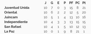 En cuanto al grupo dorado, que resolvía un campeón que pasa directamente a la final del Clausura, la resolución fue espectacular. Oriental y Juventud Unida iban por esa posición, los de Rodríguez llegaron a la instancia con una unidad de ventaja, pero no la pudieron sostener. Eso se dio porque el «Verdolaga» lo ganó cuando se entraba en descuentos de la mano de una definición en la boca del arco de Lucas Peraza, y porque Independiente se lo empató al albirrojo con una conversión cerca de la hora de Jonathan Díaz.