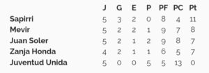 Tabla Anual: Sapirri 11 pts, Mal Abrigo 10, Juan Soler, Mevir 8, Zanja Honda, Los Buitres, Juan Soler y Wanderers 7, La Amistad 5, San Gregorio 4, Juventud Unida 0