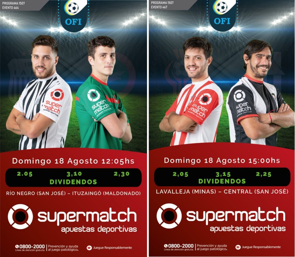 Tras juegos de ida en los que los equipos de San José sufrieron derrotas, se vienen las revanchas y una nueva posibilidad de apostar en Supermatch, sus partidos y todos los de octavos de final. De los números surge que pese a haber caído en Maldonado Río Negro vuelve a ser favorito ante Ituzaingó, con un interesante dividendo de 2,05 para el cebrita ante los 2,30 del elenco verde. Por el lado de Central su caída le vale llegar levemente de punto, con un dividendo de 2,25 ante el 2,05 de Lavalleja.