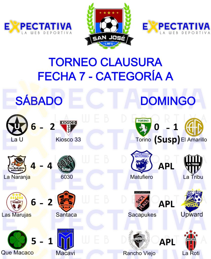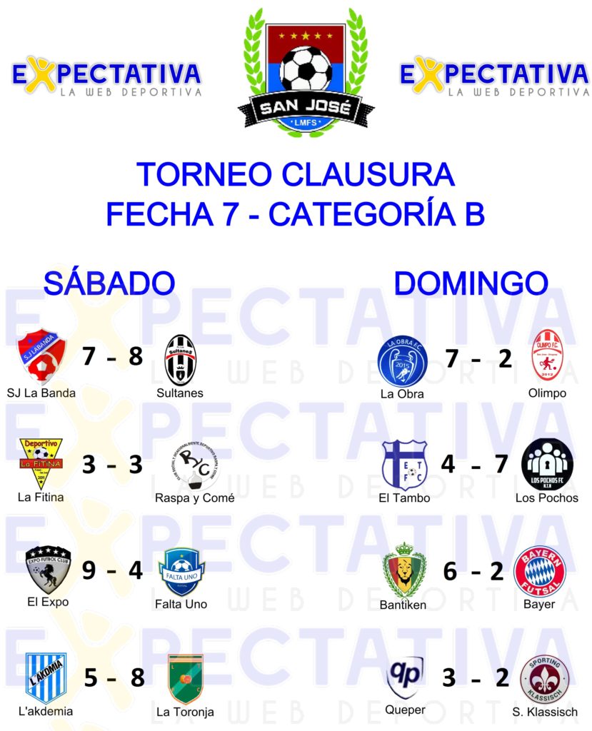 Tabla Clausura: Bantiken 12 pts, La Obra 10, SJ La Banda, La Fitina y Queper 9, Raspá y Comé, Los Sultanes, Los Pochos y La Toronja 8, Sporting Klassisch 6, El Bayern, Olimpo y Falta Uno 5, L´akademia 4, El Expo 3, El Tambo 1.