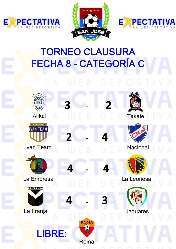 Tabla Clausura: Jaguares y La Franja 11 pts, Alikal 10, Takate 9, La Empresa 8, La Leonesa 7, La Roma y Nacional 3, Iván Team 2