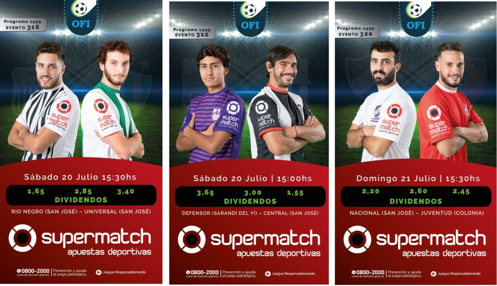 Tras dos fines de semana sin actividad, retorna la Copa «A» en OFI y de esta manera vuelve también la oportunidad de jugar con Supermatch. De acuerdo a los dividendos, es favorito Río Negro en el cruce de maragatos ante Universal, el cebrita paga 1.65 mientras que el albiverde 3.40. En el otro juego del sábado, Central viaja a Sarandí del Yí y es claro favorito, 1.55 es su dividendo ante los 3.65 de Defensor. Por último para el domingo se espera el juego de Nacional ante Juventud de Colonia, 2.20 es el pago del tricolor del arroyito y 2.45 el del rojo coloniense.