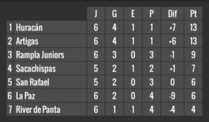 Tabla de Posiciones: San Rafael 13 pts, River 11, Artigas 10, Huracán 9, Sacachispas y Rampla Juniors 4, La Paz 3