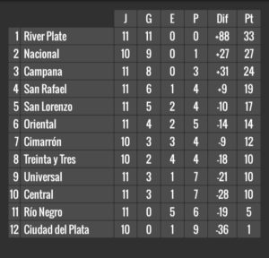 Más allá de que restan jugarse un par de partidos, Nacional ante Treinta y Tres de la fecha once y Ciudad del Plata con Cimarrón de la nueve, se conoció en la pasada noche el campeón del Apertura que tal como era previsto terminó siendo River Plate. El albirrojo goleó una vez más, ganó con un mínimo de cuatro goles de ventaja a todos sus rivales y en varios manejó más de diez de amplitud, y festejó un título absolutamente merecido.