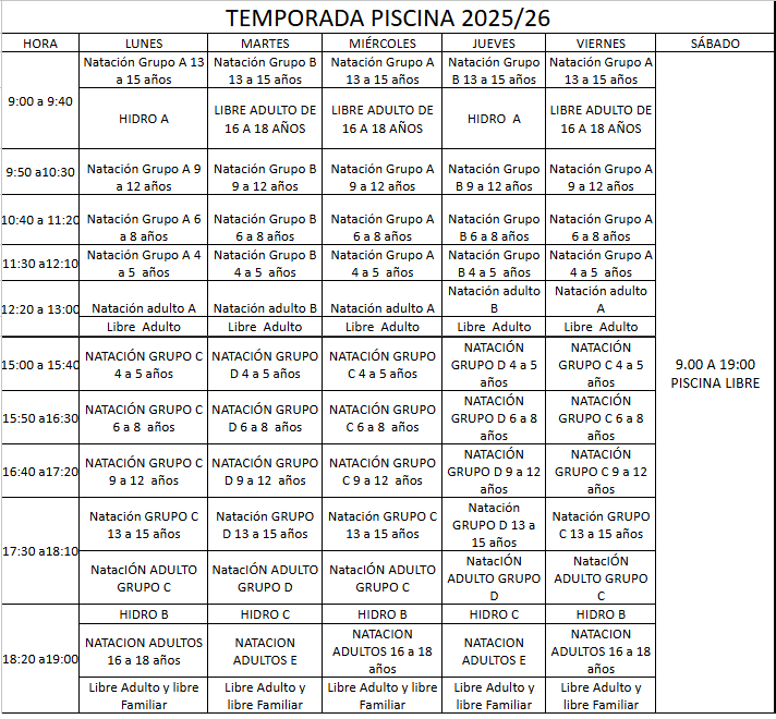 Lunes y miércoles (Piscina de Rodríguez): De 15:00 a 15:45 horas: 11, 12 y 13 años, De 15:45 a 16:30 horas: 8, 9 y 10 años, De 16:30 a 17:15 horas: 5, 6 y 7 años, De 17:15 a 18:00 horas: Mayores de 14 años.