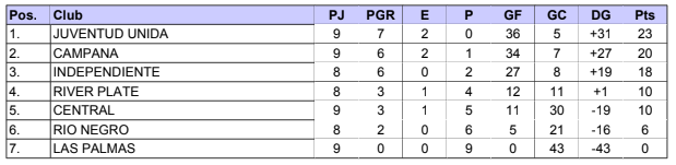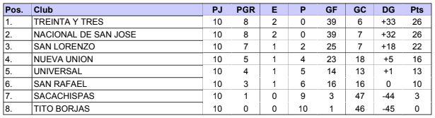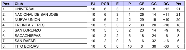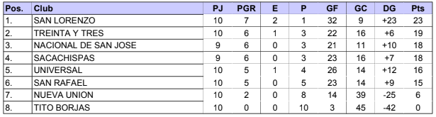 Tabla de posiciones: Treinta y Tres 23 pts, Sacachispas 22, San Lorenzo 18, Universal 17, San Rafael 15, Nueva Unión 10
