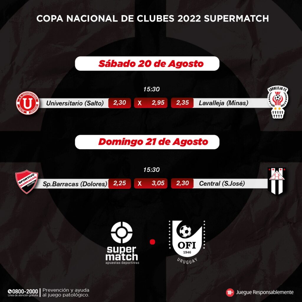 A la misma hora del domingo jugarán Wanderers de Durazno y Nacional de Nueva Helvecia (ida 0 a 0), Libertad de San Carlos y Huracán de Treinta y Tres (ida 1 a 0 para los carolinos), y FerroCarril de Salto con Litoral de Paysandú (ida 1 a 1).
