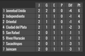 Tabla Anual: Juventud Unida 32 pts, Independiente 28, Juincam 24, Ciudad del Plata 20, River/Huracán 19, San Rafael 16, Oriental 13, Sacachispas 10