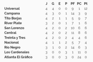 Tabla anual: Universal 21 pts, Campana 19, River Plate y Central 18, Río Negro 15, Tito Borjas 14.2, San Lorenzo 14, Treinta y Tres 10, Nacional 7.6, Atlanta El Gráfico y Los Cardenales 0