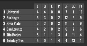 Tabla Anual: Universal y Campana 12 pts, Central 9.6, Río Negro y River Plate 9, Nacional 8.4, San Lorenzo 6, Tito Borjas 4, Atlanta El Gráfico 3.6, Treinta y Tres 1, Los Cardenales 0.