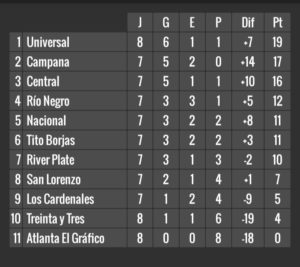 Tabla Anual: Universal 34 pts, Campana 29.5, Central 26, Río Negro 21, Nacional 19.75, River Plate 19, Tito Borjas 15, San Lorenzo 13, Treinta y Tres y Los Cardenales 5, Atlanta El Gráfico 3.75