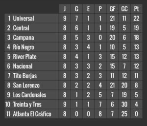 Tabla Anual: Universal 37 pts (C), Campana 30.5, Central 29, Río Negro y River Plate 22, Nacional 20.75, Tito Borjas 15, San Lorenzo 14, Treinta y Tres y Los Cardenales 5, Atlanta El Gráfico 3.75