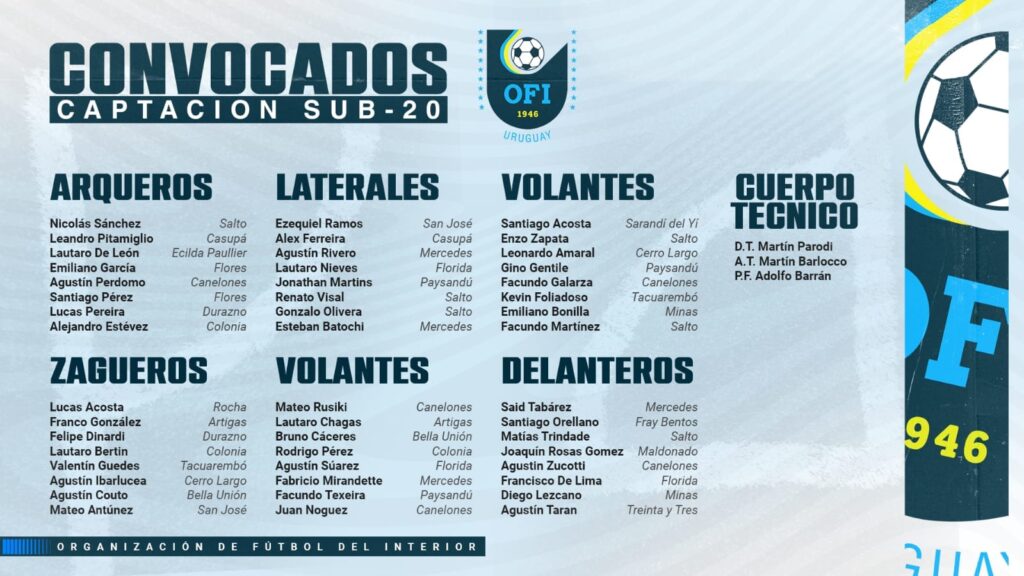 La Organización del Fútbol del Interior definió que el sanducero Martín Parodi sea el entrenador, y que se realice un campamento con jugadores representativos de todos los puntos del país en Trinidad, para que se defina el grupo final. El total de jugadores elegidos es de cuarenta y ocho, el equipo contará finalmente con . En la lista hay tres jugadores del departamento de San José, que viajarán a la capital del departamento de Flores.