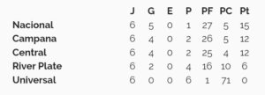 En la novena fecha los cruces son Universal vs Nacional y Central vs Campana, en la décima y última Nacional vs Central y River Plate vs Campana.